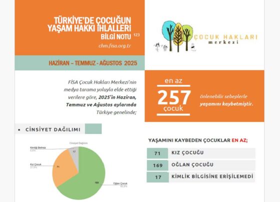 FİSA Çocuk Hakları Merkezi’nin medya tarama yoluyla elde ettiği verilere göre, 2025’in Haziran, Temmuz ve Ağustos aylarında Türkiye’de en az…