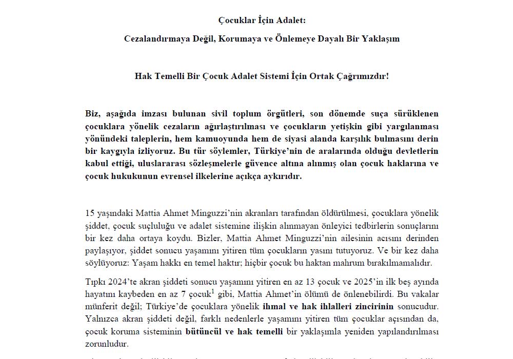 Biz, aşağıda imzası bulunan sivil toplum örgütleri, son dönemde suça sürüklenen çocuklara yönelik cezaların ağırlaştırılması ve çocukların yetişkin gibi yargılanması yönündeki taleplerin, hem kamuoyunda hem de siyasi alanda karşılık bulmasını derin bir kaygıyla izliyoruz. Bu tür söylemler, Türkiye’nin de aralarında olduğu devletlerin kabul ettiği, uluslararası sözleşmelerle güvence altına alınmış olan çocuk haklarına ve çocuk hukukunun evrensel ilkelerine açıkça aykırıdır.